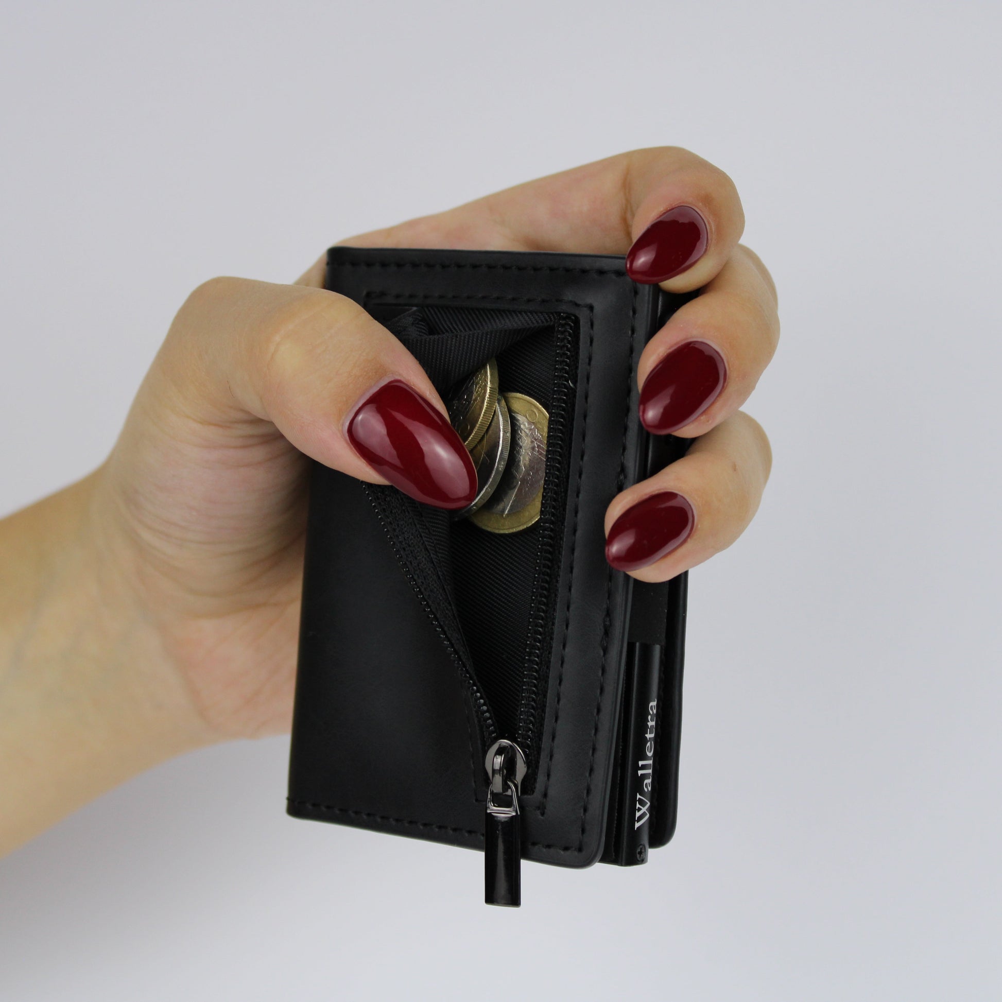 Schön schlankes Wallet, Karten sitzen fest und der Pop-Up-Mechanismus ist echt praktisch. Für Münzen ist es nicht ideal, aber für Karten und ein paar Scheine perfekt. Trägt in der Hosentasche kaum auf.